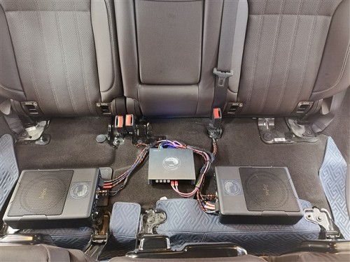 兩臺詩芬尼s-8超薄低音和一臺詩芬尼Bo6.pro功放接線隱藏安裝在座位底下,不占用空間