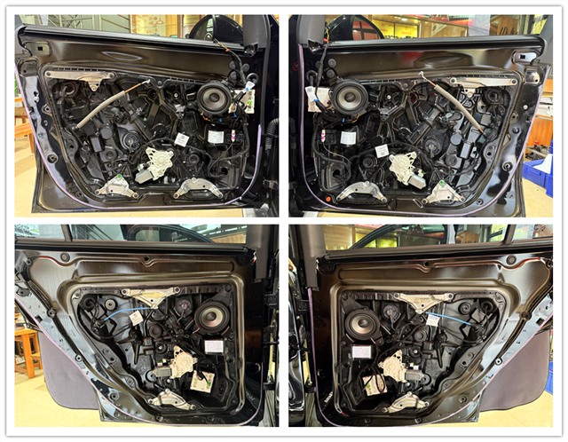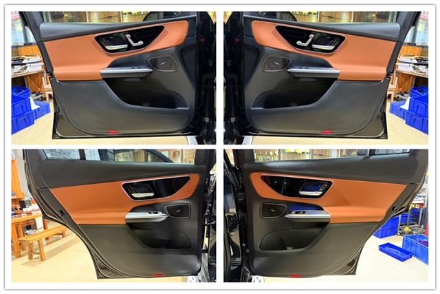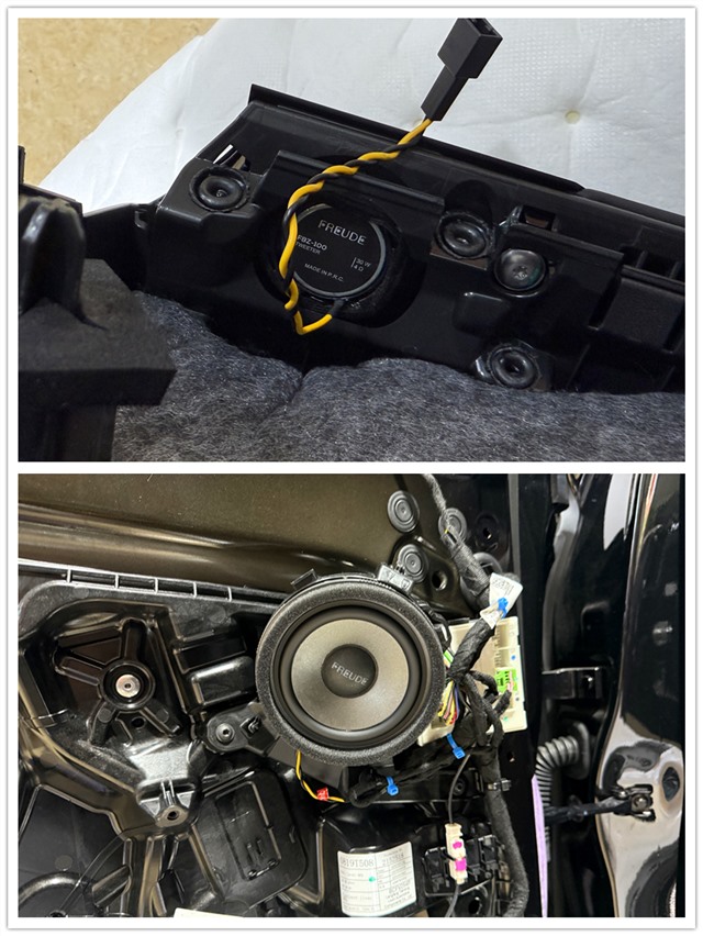 前門板部分,安裝了一套弗萊德FBZ-100兩分頻系統。在前門三角窗位置新增了兩個FBZ-100高音喇叭,提升高頻表現。原車中音喇叭被無損替換為FBZ-100中音喇叭,確保聲音的飽滿度。高音的加入使得音樂的層次感和細節顯著提升,中音喇叭的音質也變得更加清晰、圓潤。后門板的兩個中音喇叭則換裝為弗萊德FBZ-100C中音喇叭,顯著提升了中音的細節表現。