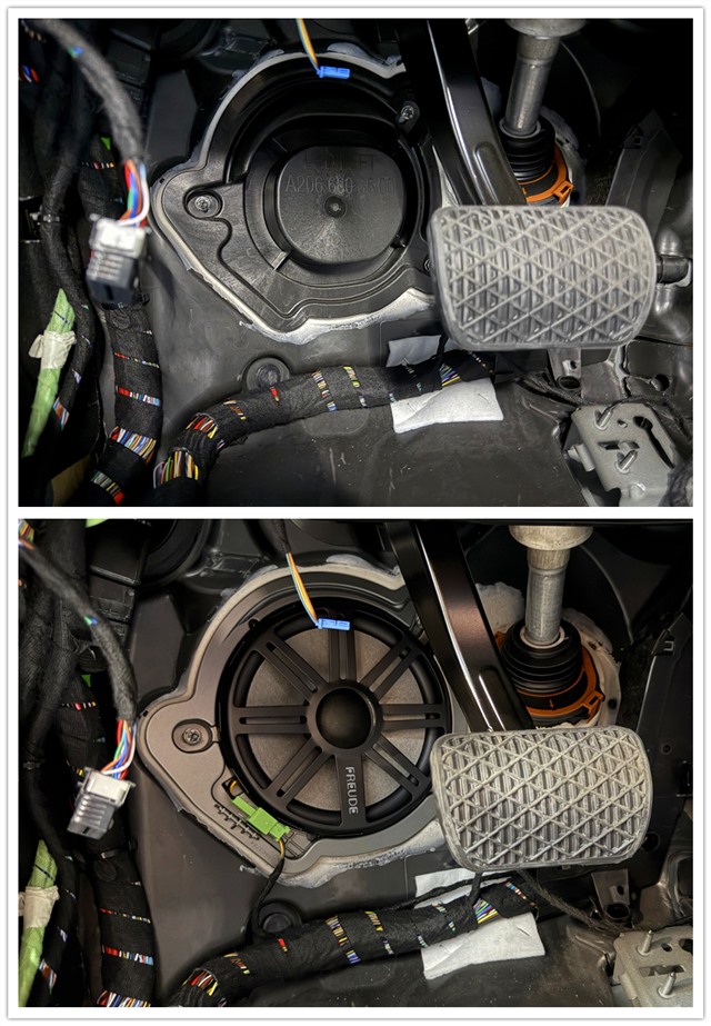 腳踏板部分,右側原有的中低音喇叭被替換為FBZ-SUB中低音喇叭,同時在左側腳踏板新增一個FBZ-SUB中低音喇叭,補齊了原車的設計不足。低音的加強讓音樂有了更好的節奏感和沖擊力