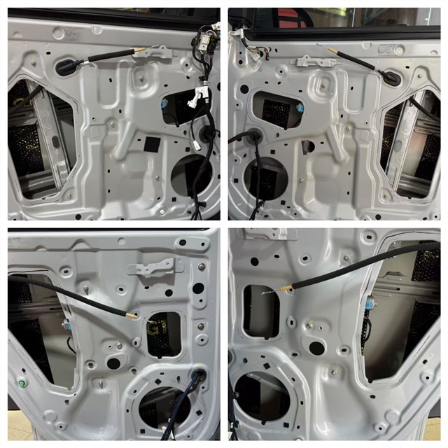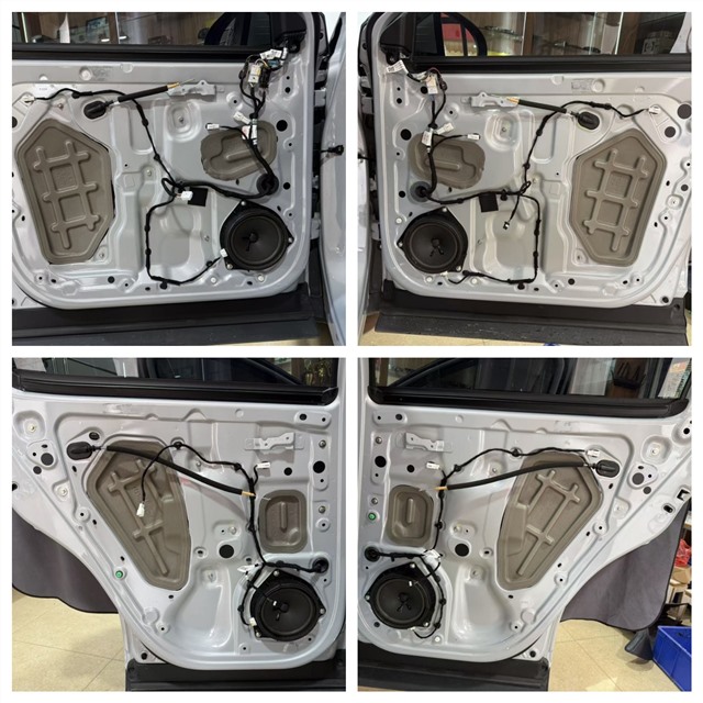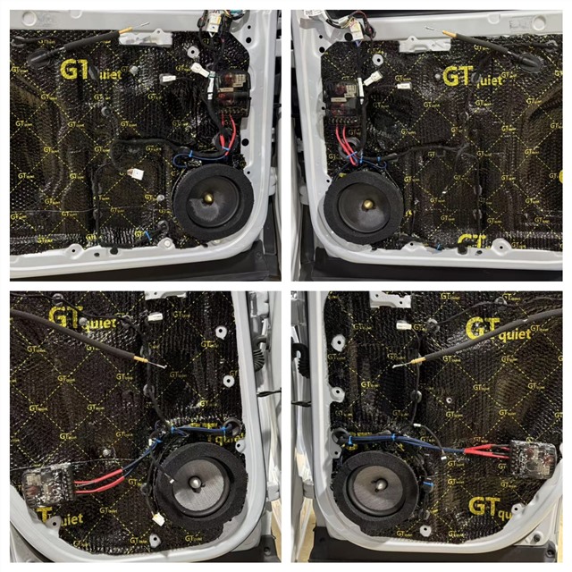 施工伊始,技師拆開比亞迪元的前后門板,原車簡陋的鐵皮結(jié)構(gòu)暴露無遺,缺乏有效的隔音處理,不僅容易產(chǎn)生共振噪音,還會嚴(yán)重影響喇叭音質(zhì)發(fā)揮。為此,泉州海林汽車音響選用 GT 四門隔音材料,對前后門板內(nèi)層進(jìn)行全面止振處理,有效抑制鈑金共振;后門板外層完成隔音施工后,再精準(zhǔn)安裝喇叭,雙重防護(hù)大幅提升門板密封性,為音響系統(tǒng)搭建穩(wěn)定的發(fā)聲環(huán)境。