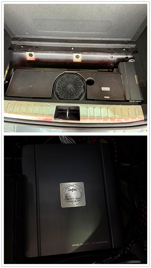 這次升級方案選擇了專車專用的線束,確保與原車音響系統無縫對接,減少改裝過程中的繁瑣接線工作和電路問題。同時,我們加裝了一臺詩芬尼BO32pro 16路DSP功放及一臺詩芬尼BO810 8路功放。這兩臺功放不僅可以強力驅動原車的揚聲器,還能通過DSP的強大處理能力對音效進行精確調校,提升音質的層次感和細節表現。