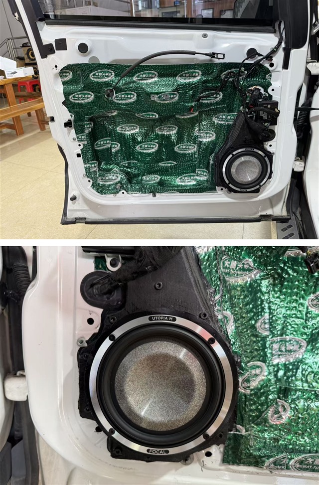 針對前聲場中低音單元的安裝,制作木制墊圈固定喇叭,避免行駛過程中因震動導致喇叭位移,保障音質穩定性;另一方面,墊圈將中低音單元適度 “突出” 安裝,使其正面發音不受門板內飾板的阻擋,發音直接而無損失。