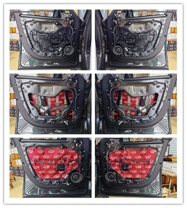后門板隔音流程展示,雙層大能紅派隔音可以增強(qiáng)鈑金厚度,并且密封多余孔洞