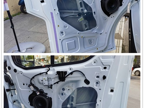 在開始音響升級之前,我們首先對福特全順的車門進行了專業的隔音處理。原車的門板內部結構簡陋,只有一層薄薄的透明塑料膜,無法有效隔絕外界噪音。我們使用安德納專業隔音材料對兩門進行了三層隔音處理,以確保最佳的音響效果。