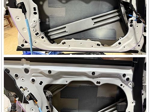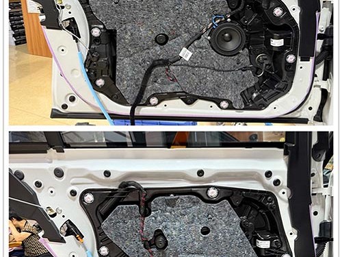 在正式粘貼隔音材料前,改裝師將前后門板的鈑金表面徹底清潔干凈,確保粘貼效果