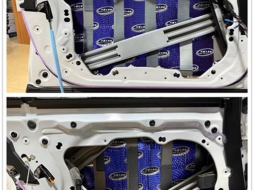 改裝師將大能藍(lán)金剛剪裁成條狀,均勻地粘貼在前后門板的內(nèi)層鈑金表面,這樣可以有效減弱金屬共振噪音