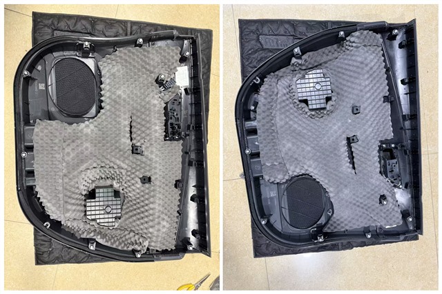施工伊始,技術團隊首先對車輛進行了細致保護,隨后展開核心的隔音工程。車門是音響發聲的重要載體,也是噪音傳入的主要路徑,GT四門隔音的施工尤為關鍵。團隊先將門板內層進行止振處理,有效抑制門板共振,再在外層鋪設隔音材料,強化密封性能,最后在門板飾蓋內加裝吸音棉,進一步吸收多余雜音,為喇叭創造了穩定靜謐的工作環境。